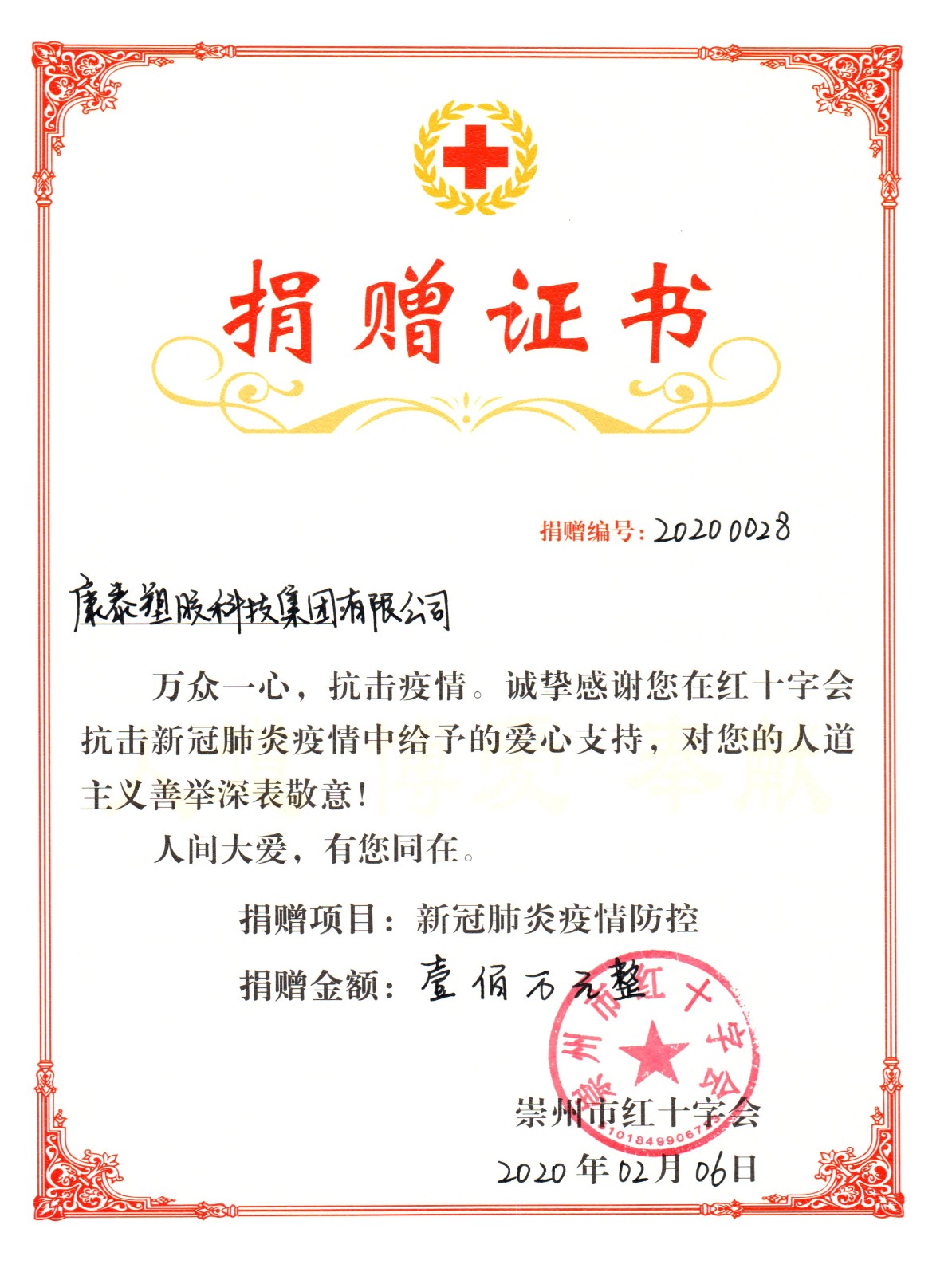 2022.03康泰集團捐款100萬元助力崇州市疫情防控阻擊戰(zhàn)2020年1月,正當全國人民喜迎新春佳節(jié)時,一場突然而來的新型冠狀病毒肺炎疫情肆虐中華大地。面對新型冠狀病毒全民戰(zhàn)爭,直接關(guān)系國家民族、企業(yè)興衰、自身安危,康泰塑膠科技集團有限公司作為一家有使命、有擔(dān)當?shù)慕ú钠髽I(yè),集團董事長林云青...閱讀人數(shù):9394 -