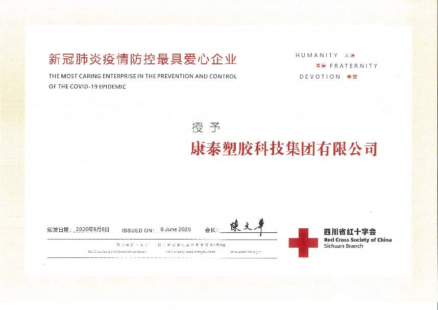 2020.11康泰集團榮獲四川省“新冠肺炎疫情防控最具愛心企業(yè)”稱號近日,為表彰康泰塑膠科技集團在新冠疫情防控工作中的突出貢獻,四川省紅十字會授予集團“新冠肺炎疫情防控最具愛心企業(yè)”榮譽稱號。2020年1月,正當全國人民喜迎新春佳節(jié)時,一場突如其來的新型冠狀病毒肺炎疫情肆虐中華大地。面對新型冠狀病...閱讀人數(shù):7993 -