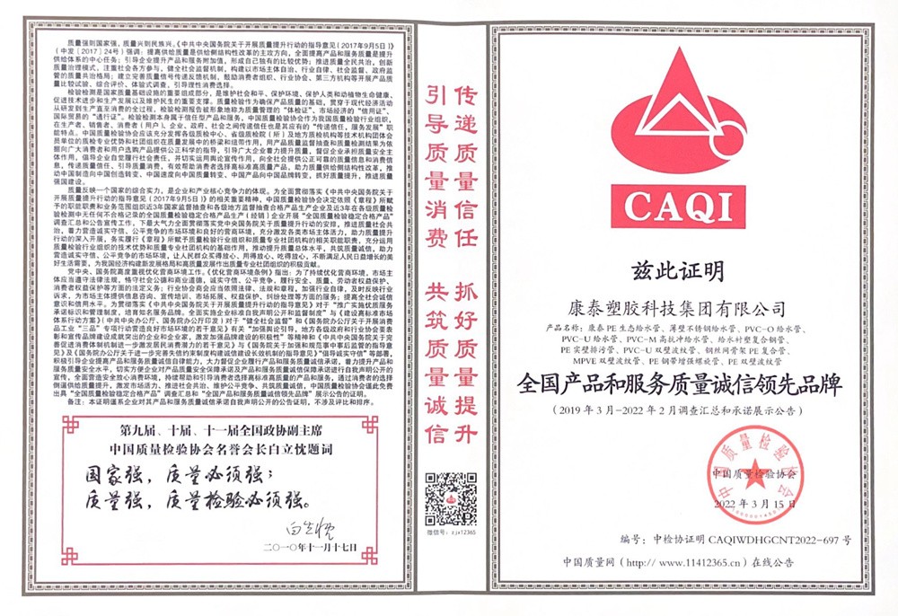 近日,憑借優(yōu)質(zhì)的產(chǎn)品、完善的服務(wù)、良好的口碑,康泰集團(tuán)一舉榮獲中國(guó)質(zhì)量檢驗(yàn)協(xié)會(huì)“全國(guó)塑料管道行業(yè)質(zhì)量領(lǐng)先企業(yè)”、“全國(guó)產(chǎn)品和服務(wù)質(zhì)量誠(chéng)信領(lǐng)先品牌”兩項(xiàng)榮譽(yù)。