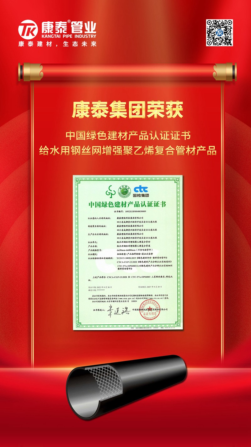 近日,康泰塑膠的給水用聚乙烯(PE)管材、管件產(chǎn)品,燃氣用埋地聚乙烯(PE)管材、管件產(chǎn)品,冷熱水用聚丙烯(PPR)管材、管件產(chǎn)品,埋地用聚乙烯(PE)雙壁波紋管材產(chǎn)品,冷熱水用耐熱聚乙烯(PE-RT)管材產(chǎn)品,給水用鋼絲網(wǎng)增強聚乙烯復(fù)合管材產(chǎn)品順利中國國檢測試控股集團股份有限公司認證審核,獲得中國綠色產(chǎn)品認證證書。充分展現(xiàn)了康泰塑膠獲證產(chǎn)品在多種綠色屬性和考核指標(biāo)的硬核實力。