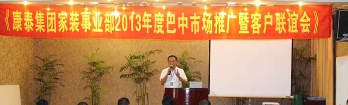??? 16日下午,“康泰集團(tuán)家裝事業(yè)部2013年度巴中市場(chǎng)推廣暨客戶聯(lián)誼會(huì)”在琴鶴苑召開。會(huì)議上,營(yíng)銷中心總監(jiān)何朝暉向經(jīng)銷商們介紹了公司品牌營(yíng)銷的戰(zhàn)略規(guī)劃。公司重視規(guī)模,通過品牌策劃拓展終端市場(chǎng)的各種政策與支持堅(jiān)定了商家們與康泰共同發(fā)展的信心和決心。