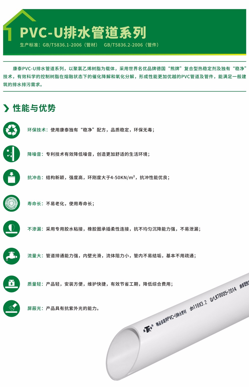 生產(chǎn)標(biāo)準(zhǔn):GB/T5836.1-2006(管材) GB/T5836.2-2006(管件)