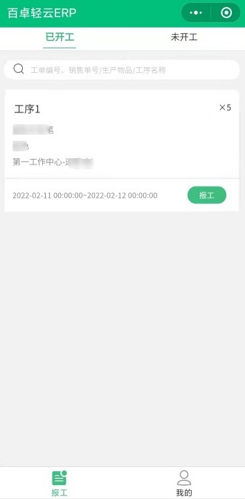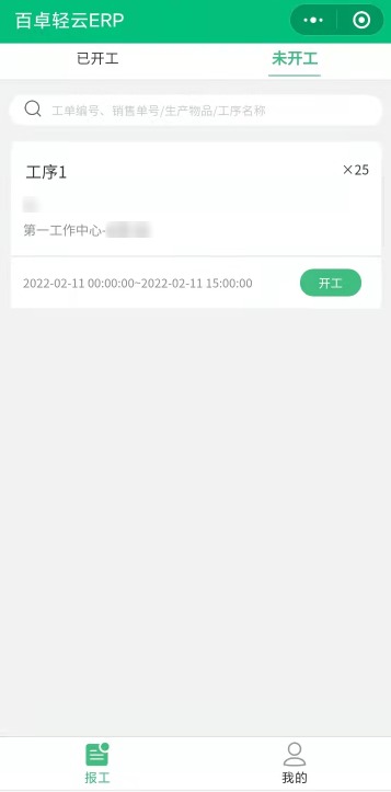 點(diǎn)擊主導(dǎo)航“報(bào)工”即可打開(kāi)工序任務(wù)列表,默認(rèn)選擇已開(kāi)工工序任務(wù),點(diǎn)擊未開(kāi)工、已開(kāi)工,可切換至對(duì)應(yīng)欄目下列表。