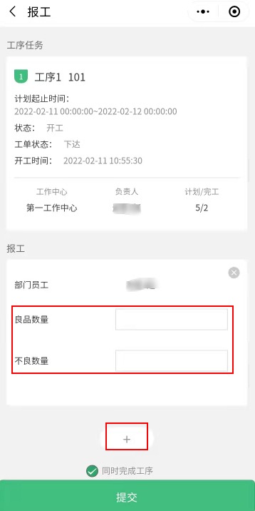 點(diǎn)擊“報(bào)工”,可填寫(xiě)良品數(shù)量、不良數(shù)量,點(diǎn)擊底部的“+”,可添加員工信息。