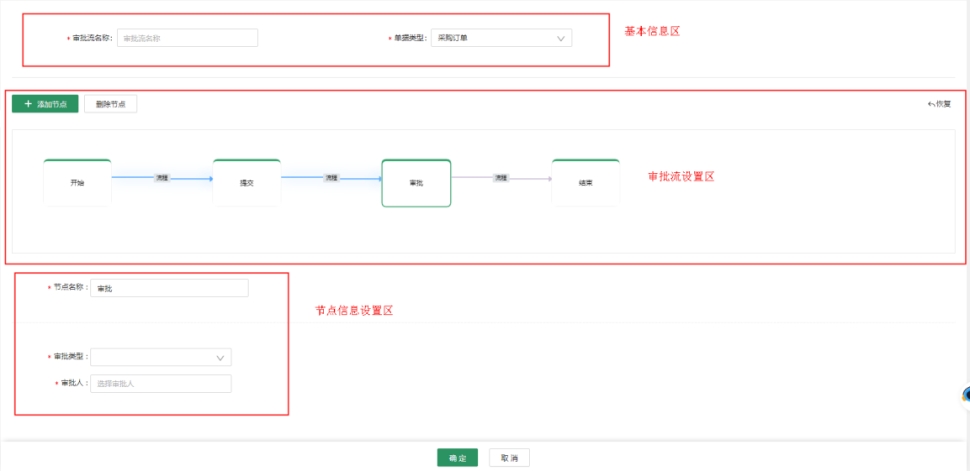 2. 審批流設(shè)置區(qū):主要用于審批流的設(shè)計(jì),添加、刪除審批節(jié)點(diǎn),控制審批節(jié)點(diǎn)的順