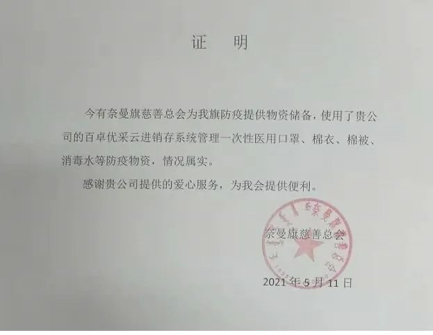 5月11日,百卓網(wǎng)絡(luò)科技有限公司收到來自奈曼旗慈善總會(huì)的一封感謝信。該會(huì)使用百卓優(yōu)采云進(jìn)銷存系統(tǒng)管理一次性醫(yī)用口罩、棉衣、棉被、消毒水等防疫物資,經(jīng)過工作人員溝通了解,百卓網(wǎng)絡(luò)科技有限公司決定免費(fèi)贈(zèng)送奈曼旗慈善總會(huì)一年的進(jìn)銷存系統(tǒng)的使用權(quán)!